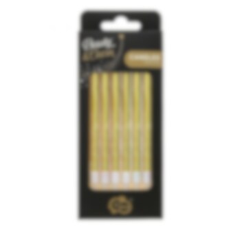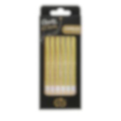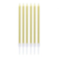 Dessa tårtljus i fin guldfärg är det perfekta tillägget till varje festlig tårta. Varje förpackning innehåller 6 tårtljus som har en höjd på 13,5 cm och det ingår även 6 stycken hållare för enkel användning.