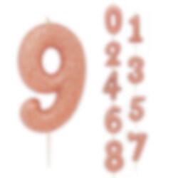 Tårtljus i roseguld formade som siffror att dekorera din tårta eller andra bakverk med. Tårtljusen är täckta med ett skimrande glitter. Kombinera hur du vill då ljusen finns tillgängliga i siffrorna 0-9.