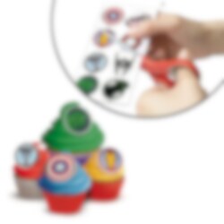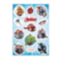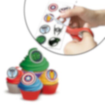 Förpackning med 13 st. sockerfria sockerdekorationer med snygga motiv från Marvels Avengers. Dekorera din tårta eller muffins med dessa när det vankas kalas. Du hittar även innehållsförteckningen nedan.