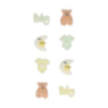 Setet innehåller 8 dekorationer med babymotiv: 2 nallebjörnar, 2 bodys, 2 månformade dekorationer och 2 med babytext. Figurerna är cirka 2 cm i diameter och tillverkade av 96 % socker. Produkten är glutenfri (NL-090-131 certifierad) och innehåller äggvita. Förvaras svalt och torrt, 12-20 °C, skyddat från direkt solljus och starka dofter.