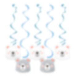5 st. hängande swirl dekorationer i blåa nyanser med motiv av grå och vita björnar. En fin dekoration till kalaset med björntema. 2 st. av dekorationerna är ca 99 cm långa och 3 st. av dekorationerna är ca 76 cm långa.
