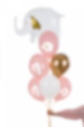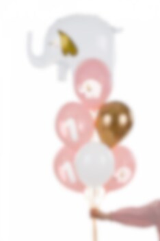 Förpackningen innehåller 4 st. ljusrosa ballonger med motiv av 2 st. vita ettor och 2 st. vita elefanter, 1 st. vit ballong och 1 st. guldfolierad ballong.