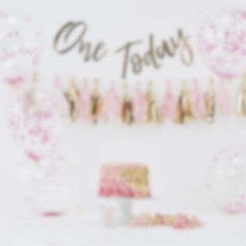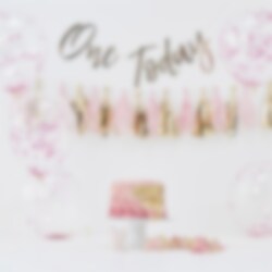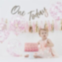 Smash the Cake kit i färgerna rosa och guld som du kan använda dig av för att ta söta kort under 1-års kalaset. Förpackningen inkluderar:
