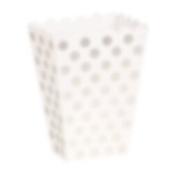 8 st vita snacksboxar med silverfärgade prickar. Dessa boxar blir perfekta till att servera popcorn eller chips ur på kalaset. Bjuder du över kompisar på filmkväll blir dessa toppen att dela ut så alla får varsin att mumsa ur. Fyllda med nötter, popcorn godis eller annat gott blir dessa en fin dekoration till din dukning inför kalaset. Snacksboxarna är av pappkartong, ca 11 x 14 cm stora.