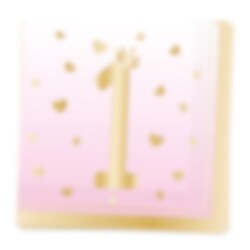 16 st. servetter i en rosa ombre med guldfärgade kanter och med motiv av en etta med en krona på toppen, samt hjärtan runt omkring i guldfärg. Fina att inkludera i kalasdukningen inför 1-årskalaset.