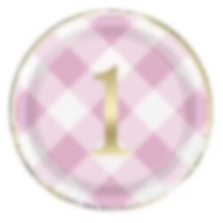 8 st. papptallrikar i ett rosa- och vitrutigt mönster med en guldfolierad etta i mitten samt guldfolierade kanter. Ett snyggt dukningstillbehör att ha med till 1-års kalaset. Tallrikarna är ca 23 cm i diameter.