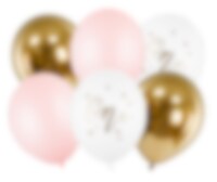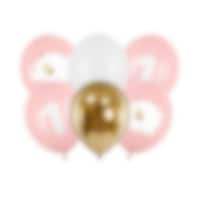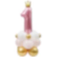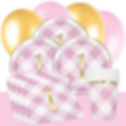Detta färdiga kalaspaket med vackra tillbehör till 1-årskalaset inkluderar rosa tallrikar med guldfoliering (23 cm), rosarutiga pappmuggar med guldfolierad kant (270 ml) och servetter (33 x 33 cm) för 8, 16 eller 24 personer. Utöver det så ingår 10 st. rosa- och 10 st. guldfärgade ballonger samt en ljusrosa bordsduk av plast (137 x 274 cm). I paketet för 24 gäster så ingår 2 st. bordsdukar.