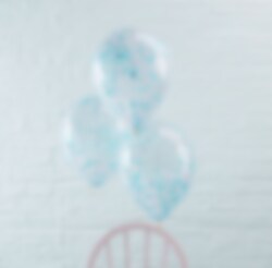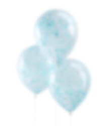 5 st. genomskinliga ballonger fyllda med ljusblå konfetti invändigt. Ballongerna blir jättefina till både kalas, dop och babyshower. Ballongerna kan blåsas upp med luft eller med helium och blir ca 30 cm i diameter uppblåsta.