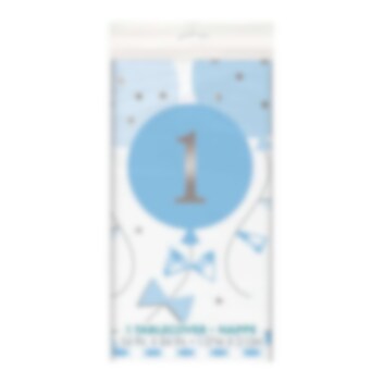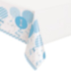 Bordsduk av plast med en vit bakgrund och motiv av blå ballonger, rosetter och siffran 1 i silverfärg. Ett fint tillbehör ha med till dukningen inför 1-års kalaset. Duken är ca 137 x 213 cm stor.