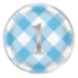 8 st. papptallrikar i ett blå- och vitrutigt mönster med en silverfolierad etta i mitten samt silverfolierade kanter. Ett snyggt dukningstillbehör att ha med till 1-års kalaset. Tallrikarna är ca 23 cm i diameter.