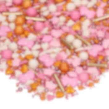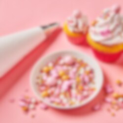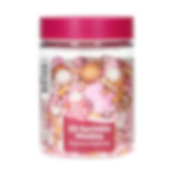 Ge dina bakverk en magisk touch med detta förtrollande strössel! Denna exklusiva mix kombinerar gnistrande pärlor, söta hjärtan och lekfulla 3D-figurer i rosa, vitt och guld. Perfekt för att dekorera cupcakes, tårtor och kakor till prinsesskalaset eller andra festliga tillfällen.