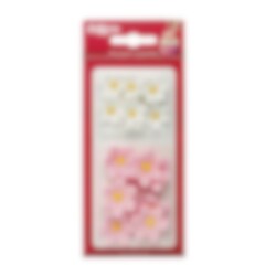 14 stycken detaljerade blommor i en mix av rosa och vita nyanser med gula mittpunkter, perfekta för att skapa eleganta dekorationer på cupcakes, tårtor och andra bakverk.