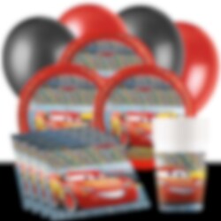Detta färdiga kalaspaket med originaltillbehör i Diney Bilar tema inkluderar tallrikar (23 cm), pappmuggar (200 ml) och servetter (33 x 33 cm) för 8 eller 16 personer, utöver det så ingår 10 st. röda och 10 st. svarta ballonger och en svart bordsduk av plast (137 x 274 cm).