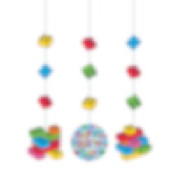 3 st. hängande dekorationer med byggkloss-motiv från temat Block Party. Perfekta att dekorera med till kalaset. Förpackningen innehåller 3 dekorationer av papp som 81 cm långa, med motiv som är 18 cm i diameter.