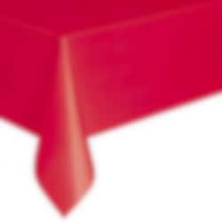 Bordsduk av plast i fin röd färg som är 137 x 274 cm stor.