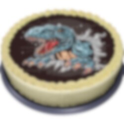 Tårtbild av sugarpaste med en lite läskig dinosaurie. Skapa enkelt en snygg tårta till kalaset. Tårtbilden är ätbar och färdig att läggas på tårtan. Storlek: Tårtbilden är ca 20 cm i diameter. Förvaring: Förvaras torrt och svalt och har en hållbarhet på ca 1 år.