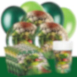 Detta färdiga kalaspaket i tufft dinosaurietema inkluderar tallrikar (22,5 cm), pappmuggar (270 ml) och servetter (33 x 33 cm) för 10 eller 20 personer, utöver det så ingår 10 st. ljusgröna och 10 st. mörkgröna ballonger samt en mörkgrön bordsduk av plast (137 x 274 cm).