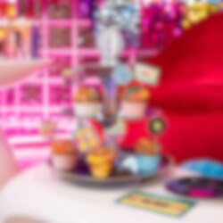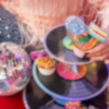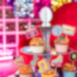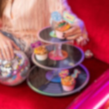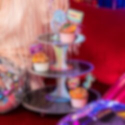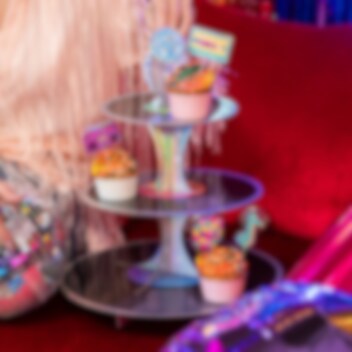 Ge festen en glittrande touch med denna spektakulära muffinsställning i discotema. Med tre våningar och en glänsande discokula på toppen blir den en perfekt centerpiece på dessertbordet. Ställningen är 39 cm hög och 34 cm bred, utformad för att lyfta fram dina muffins och bakverk på ett festligt sätt. Ett måste för alla som älskar disco och kalas med stil.