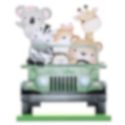 Supergullig bordsdekoration i trä med motiv av safari djur som åker på upptäcktsfärd. Dekorationen är 15 x 18,5 cm stor.