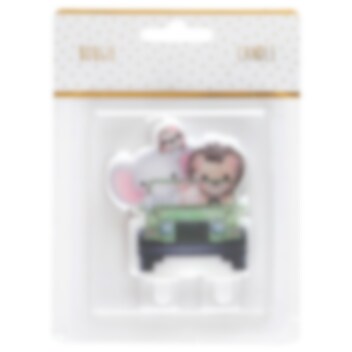 Gulligt tårtljus med motiv av safaridjur som kör en bil. Tårtljuset är ca 6,4 x 7,5 cm stort.