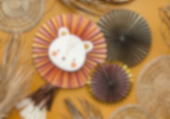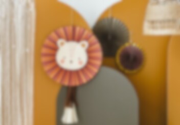 Förpackning med tre hängande dekorationer i läckra färger varav en dekoration föreställer ett lejon. Perfekt dekoration till kalas eller fest. Dekorationerna är 26, 35 och 43 cm stora.