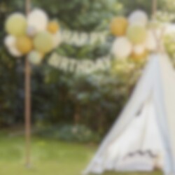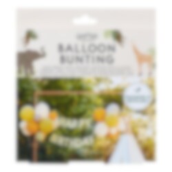 Dekorationskit med ballonger och en girlang med texten "Happy Birthday". En snygg dekoration att ha på ditt djungelkalas eller varför inte på sommarfesten.