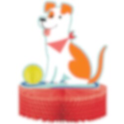 Bordsdekoration av röd honeycomb med motiv av en hund och dennes boll. Dekorera bordet med denna när det är kalas med hundtema. Bordsdekorationen är ca 23 x 30 cm stor.