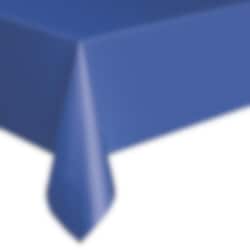 Bordsduk av plast i mörkblå färg som är 137 x 274 cm stor.