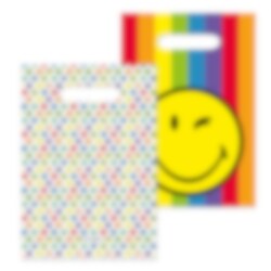 8 st. kalaspåsar av papper i regnbågsfärger med motiv av en blinkande smiley i mitten på ena sidan och färgglada smileys på en vit bakgrund på andra sidan. Fyll påsarna med godis och leksaker och ge dem sedan till vännerna under kalaset.