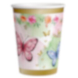 Dessa vackra pappmuggar med fjärilsmotiv och guldkant blir en fin detalj på kalaset. Muggarna rymmer 250 ml och säljs i 8-pack.