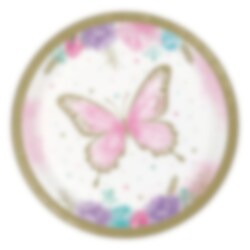 8 st. pappassietter i glada färger med motiv av en fjäril i mitten som är omringad av blommor. Assietterna är 18 cm i diameter.