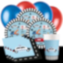 Detta färdiga kalaspaket med härliga tillbehör i Fordonstema inkluderar tallrikar (23 cm), pappmuggar (250 ml) och servetter (33 x 33 cm) för 8 eller 16 personer. Utöver det så ingår 10 st. röda ballonger och 10 st. mörkblå ballonger och en svart bordsduk av plast (137 x 274 cm)