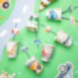 6 st. pappmuggar med färgglada fordonsmotiv, perfekta till ett roligt kalas med fordonstema! Muggarna är 9 cm höga och rymmer 220 ml.