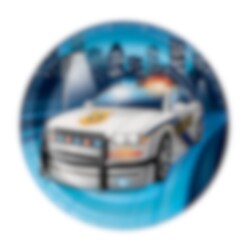 8 st. assietter med motiv av en tuff polisbil. Assietterna är ca 18 cm i diameter.