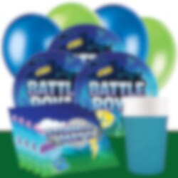 Detta färdiga kalaspaket med snygga Battle Royal tillbehör inkluderar tallrikar (23 cm), matchande aqua-blå pappmuggar (250 ml) och servetter (33 x 33 cm) för 8, 16 eller 24 personer. Utöver det så ingår 10 st. gröna ballonger och 10 st. mörkblå ballonger och en mörkgrön bordsduk av plast (137 x 274 cm). I paketet för 24 gäster så ingår 2 st. bordsdukar.