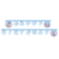 Vacker girlang av papp med texten "Happy Birthday" och fina motiv från Disney-filmen Frost. Girlangen är 2 meter lång.