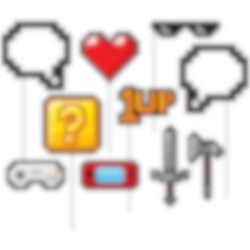 10 st. photoprops med roliga spelmotiv i retrostil. Dessa kan du använda när du och dina vänner vill ta fina och roliga kort på kalaset.