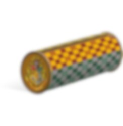 Fodralet har ett rutmönster i färgerna för Gryffindor och Slytherin, med Hogwarts-emblemet i guld på sidorna. Den runda formen gör det rymligt och praktiskt, perfekt för både fjäderpennor och moderna kulspetspennor.