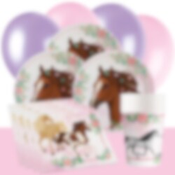 Detta färdiga kalaspaket med söta tillbehör i hästtema inkluderar tallrikar (23 cm), pappmuggar (250 ml) och servetter (33 x 33 cm) för 8, 16 eller 24 personer. Utöver det så ingår 10 st. rosa och 10 st. ljuslila ballonger och en ljusrosa bordsduk av plast (137 x 274 cm). I paketet för 24 gäster så ingår 2 st. bordsdukar.