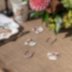 Fin konfetti i trä med motiv av hästar och hästskor. Lyxiga att pynta med på bordet inför kalaset. Konfettin är 4 x 4,5 cm stora och du får sammanlagt 10 stycken i en påse.