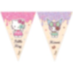 Färgglad flaggirlang av papper med motiv av Hello Kitty och Kuromi. En fin dekoration för att skapa en rolig stämning på kalaset!