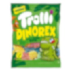 Roliga syrliga gelégodisar formade som olika dinosaurier med fruktig smak.