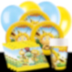 Detta färdiga kalaspaket med originaltillbehör från Biet Maja inkluderar tallrikar (23 cm), pappmuggar (250 ml) och servetter (33 x 33 cm) för 10 eller 20 personer. Utöver det så ingår 10 st. gula och 10 st. ljusblå ballonger samt en svart bordsduk av plast (137 x 274 cm).