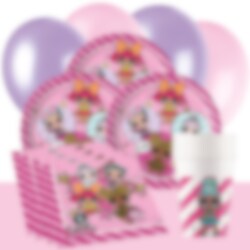 Detta färdiga kalaspaket med originaltillbehör från LOL Surprise inkluderar tallrikar (23 cm), pappmuggar (200 ml) och servetter (33 x 33 cm) för 8, 16 eller 24 personer. Utöver det så ingår 10 st. rosa ballonger och 10 st. lila ballonger och en rosa bordsduk av plast (137 x 274 cm). I paketet för 24 gäster så ingår 2 st. bordsdukar.