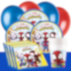 Detta färdiga kalaspaket med originaltillbehör från Spidey inkluderar tallrikar (23 cm), Spidey pappmuggar (200 ml) och Spidey servetter (33 x 33 cm) för 8, 16 eller 24 personer. Utöver det så ingår 10 st. röda ballonger och 10 st. mörkblå ballonger och en mörkblå bordsduk av plast (137 x 274 cm). I paketet för 24 gäster så ingår 2 st. bordsdukar.