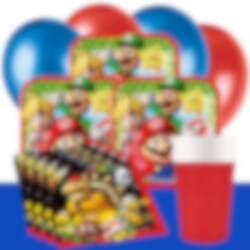 Detta färdiga kalaspaket med Super Mario inkluderar tallrikar (18 cm), röda pappmuggar (266 ml) och servetter (33 x 33 cm) för 8, 16 eller 24 personer. Utöver det så ingår 10 st. blå och 10 st. röda ballonger och en mörkblå bordsduk (137 x 274 cm). I paketet för 24 gäster så ingår 2 st. bordsdukar.