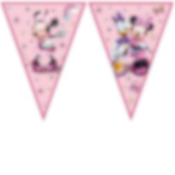 Läcker flaggirlang i papp i rosa nyanser och med gulligt motiv av Mimmi Pigg och hennes vän Kajsa Anka. En dekorativ sak att ha i rummet när det vankas ett Mimmi Pigg inspirerat kalas.
