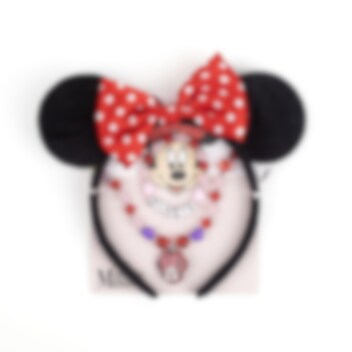 Få till en lekfull och klassisk look med detta fina smyckeset med Mimmi Pigg! Setet innehåller ett svart diadem med runda öron och Mimmis ikoniska röda rosett med vita prickar, ett färgglatt pärlarmband med bokstäverna "MINNIE", samt ett matchande halsband med en Mimmi Pigg-berlock. Perfekt för små Disney-fans.
