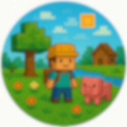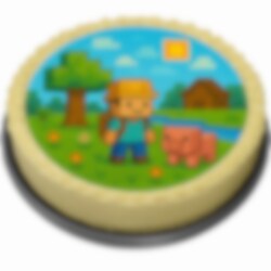 Gör tårtan till ett riktigt äventyr i pixelvärlden. Med denna färgglada och lekfulla tårtbild i sockerpasta blir det enkelt att skapa en tårta som ser både proffsig och rolig ut, perfekt till kalaset med spel- och pixeltema. Bilden föreställer en charmig figur med ryggsäck, en glad gris och ett härligt landskap med träd, stuga och blå himmel som hämtat ur ett digitalt spel.