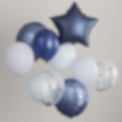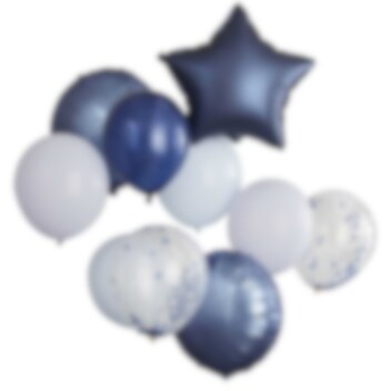 Läcker ballongbukett i fina toner av mörkblått och ljusblått. En vacker dekoration att ha till varje kalas, fest eller Babyshower.